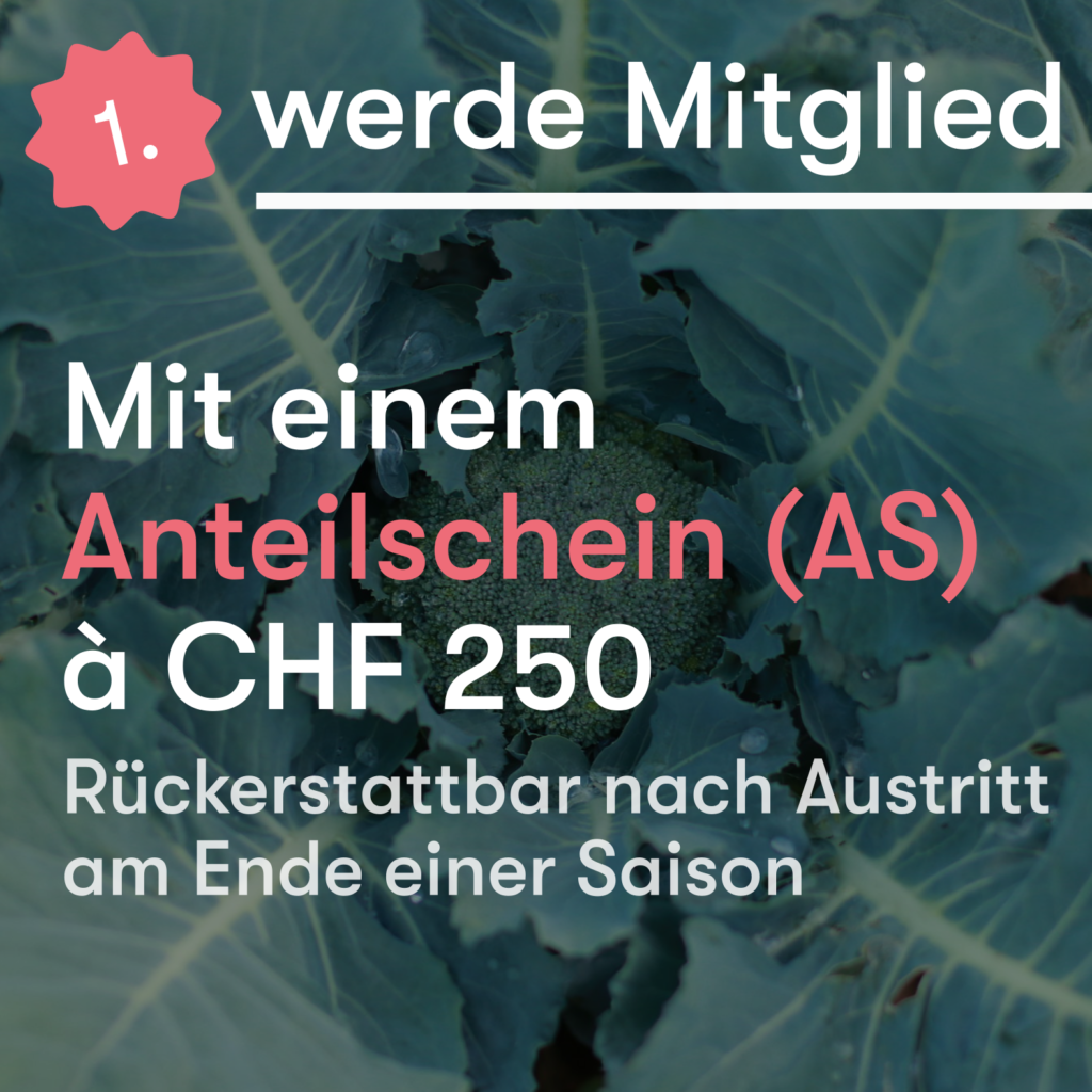 Für jeden Ernteanteil den du beziehst, benötigst du auch einen, bei Austritt rückerstattbaren, Anteilschein à CHF 250.
